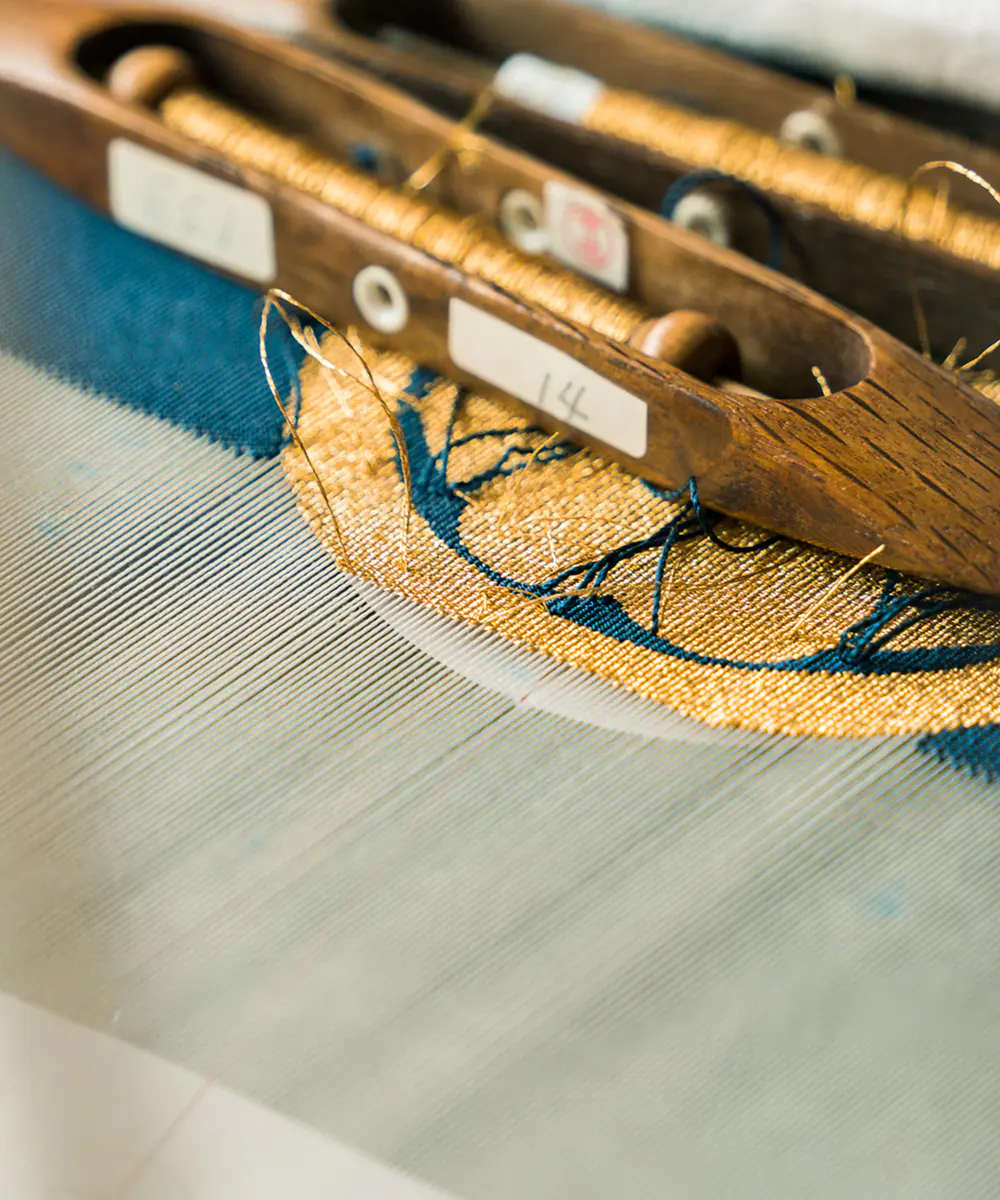 綴織は何百年、何千年も前から場所や空間を彩ってきました。豊かな表現力と、多彩な色使い、耐久性の高い組織構造から最高の織物として選ばれてきました。実際に百年前に制作されたものが、数々の文化財を今も鮮やかに彩っています。