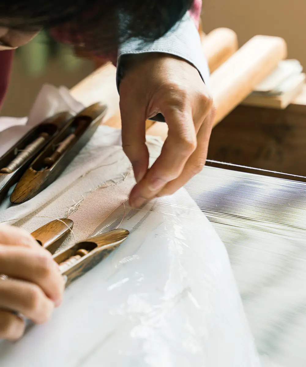 綴織はおよそ四千年の歴史を誇る織物。そして西陣織の中でも最も古い存在です。世界最古のものは古代エジプトの王墓から出土したコプト織とされています。その後世界各地に広がり、長い時間をかけて飛鳥時代に日本へと伝わってきました。弊社の始祖が創業したのは室町時代の京都。日本の綴織発祥の地である御室(おむろ)という地域で織りはじめました。後に現在の滋賀に拠点を移し、代々稼業として綴織を継承してまいりました。数千年の時を超えた「織師」のクラフトマンシップは、現代も静かに受け継がれています。