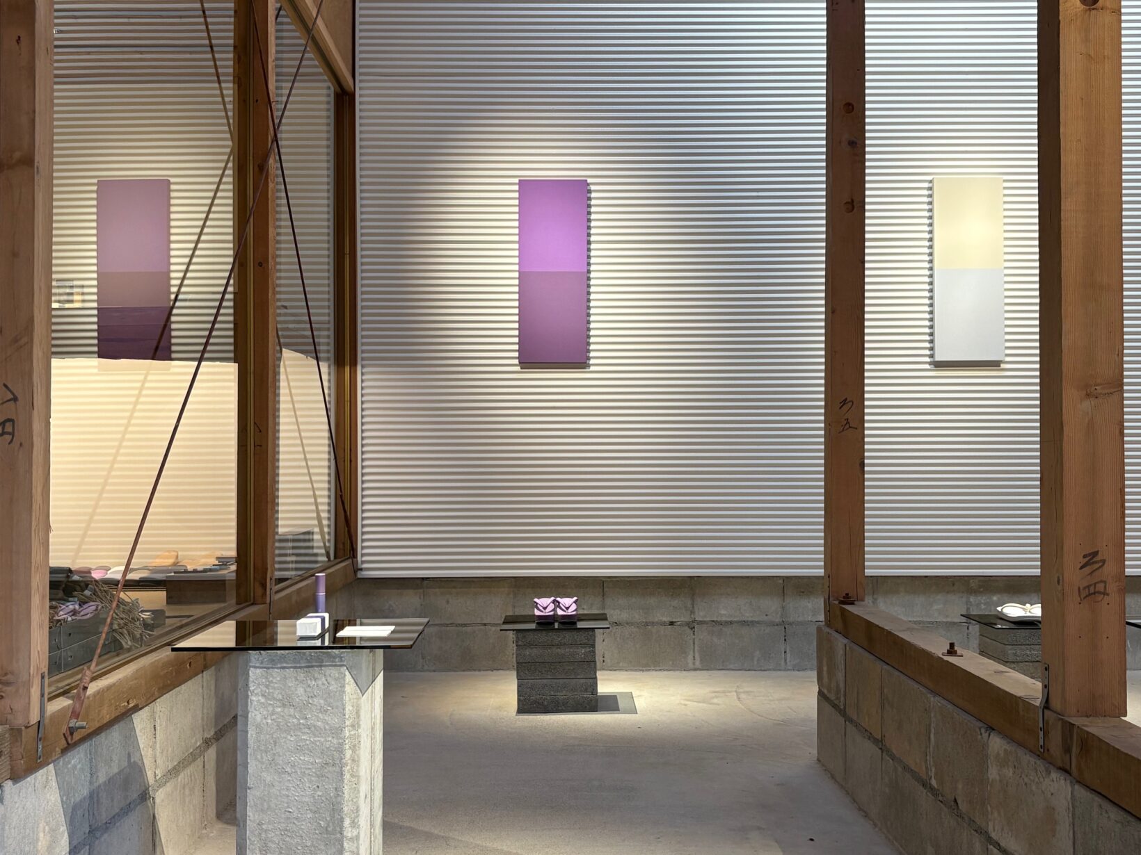 履きもの「関づか」様での展示会において、重ねの色目をテーマにした履き物とアートパネルを制作させていただいております。履き物の立体的で美しいテクスチャーと、アートパネルの均整美をぜひご覧ください。
